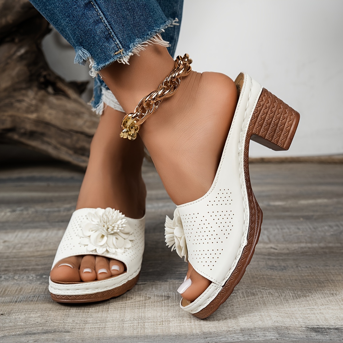 شباشب نسائية بكعب عالي وزهور – بيج بأسلوب فينتاج مع زهور بيضاء، نعل مطاطي متوسط الارتفاع
