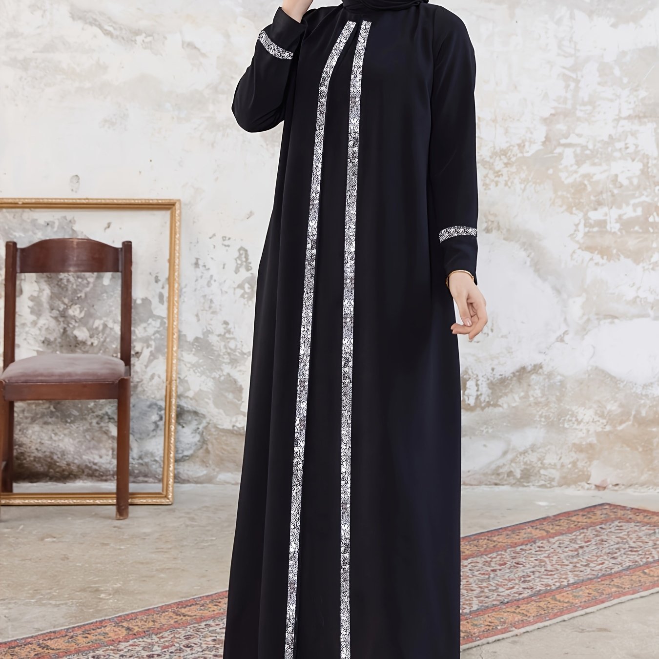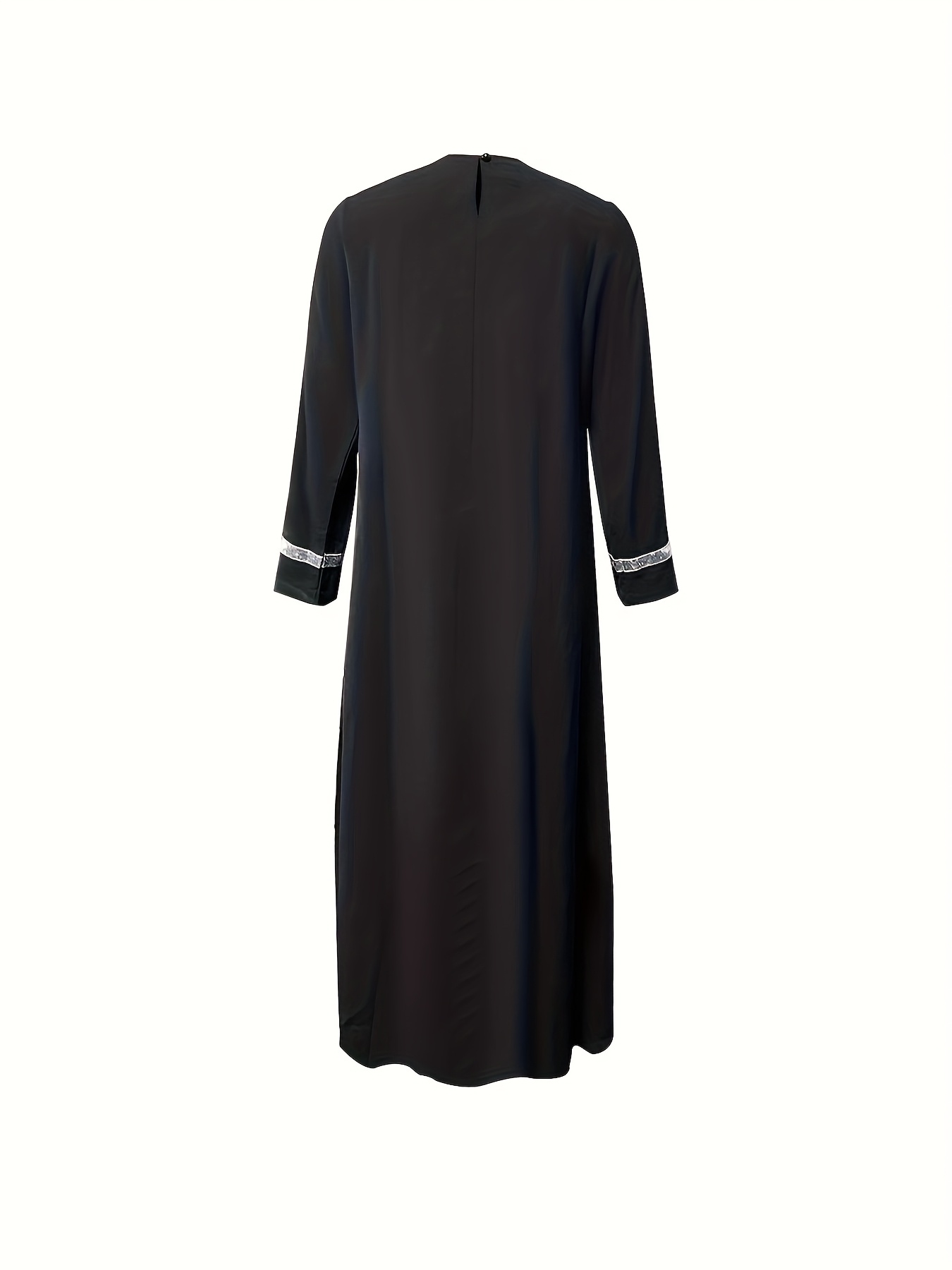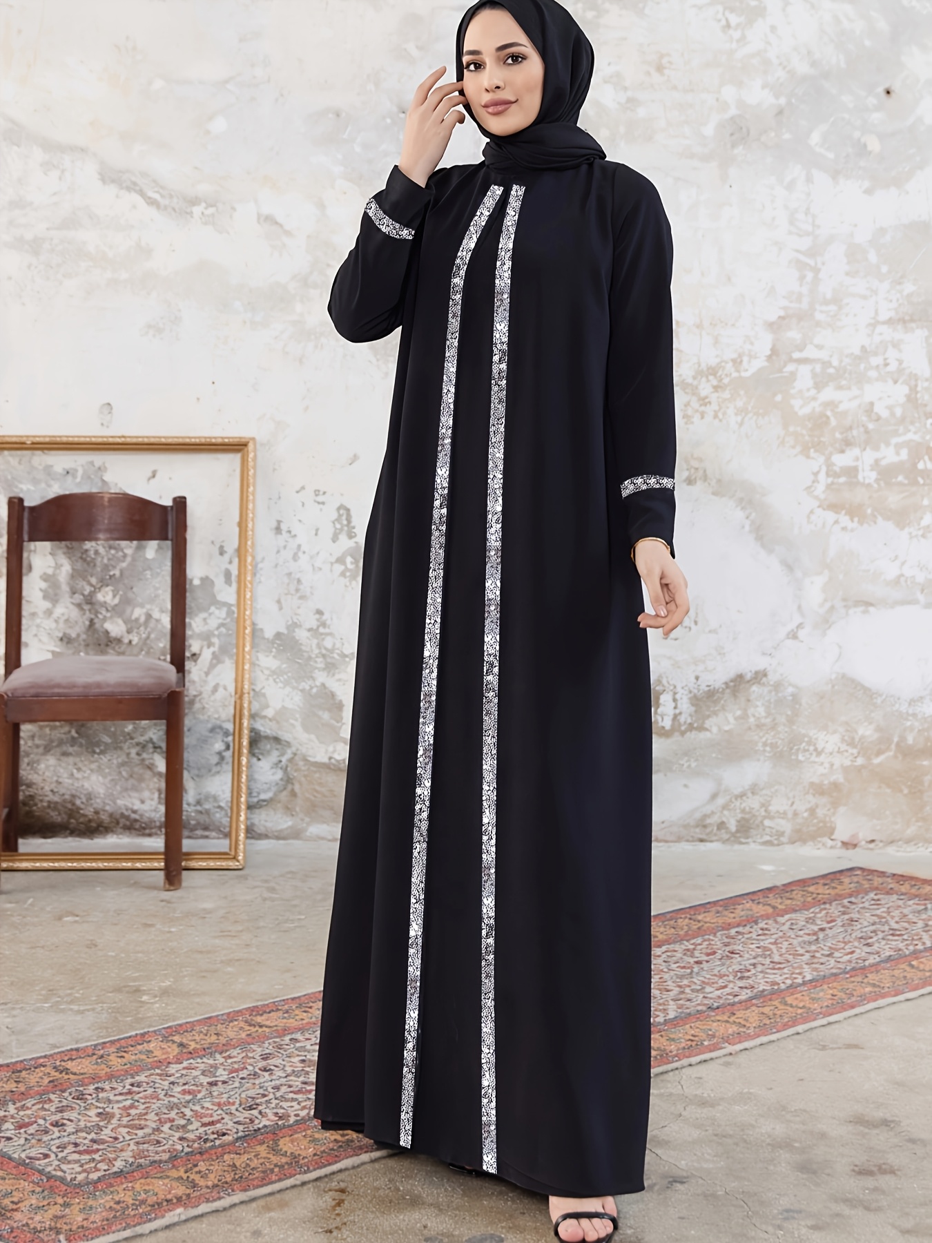 عباءة أنيقة بأكمام طويلة مع تفاصيل ترتر متباينة – نمط شرقي تقليدي، ياقة مستديرة، بوليستر