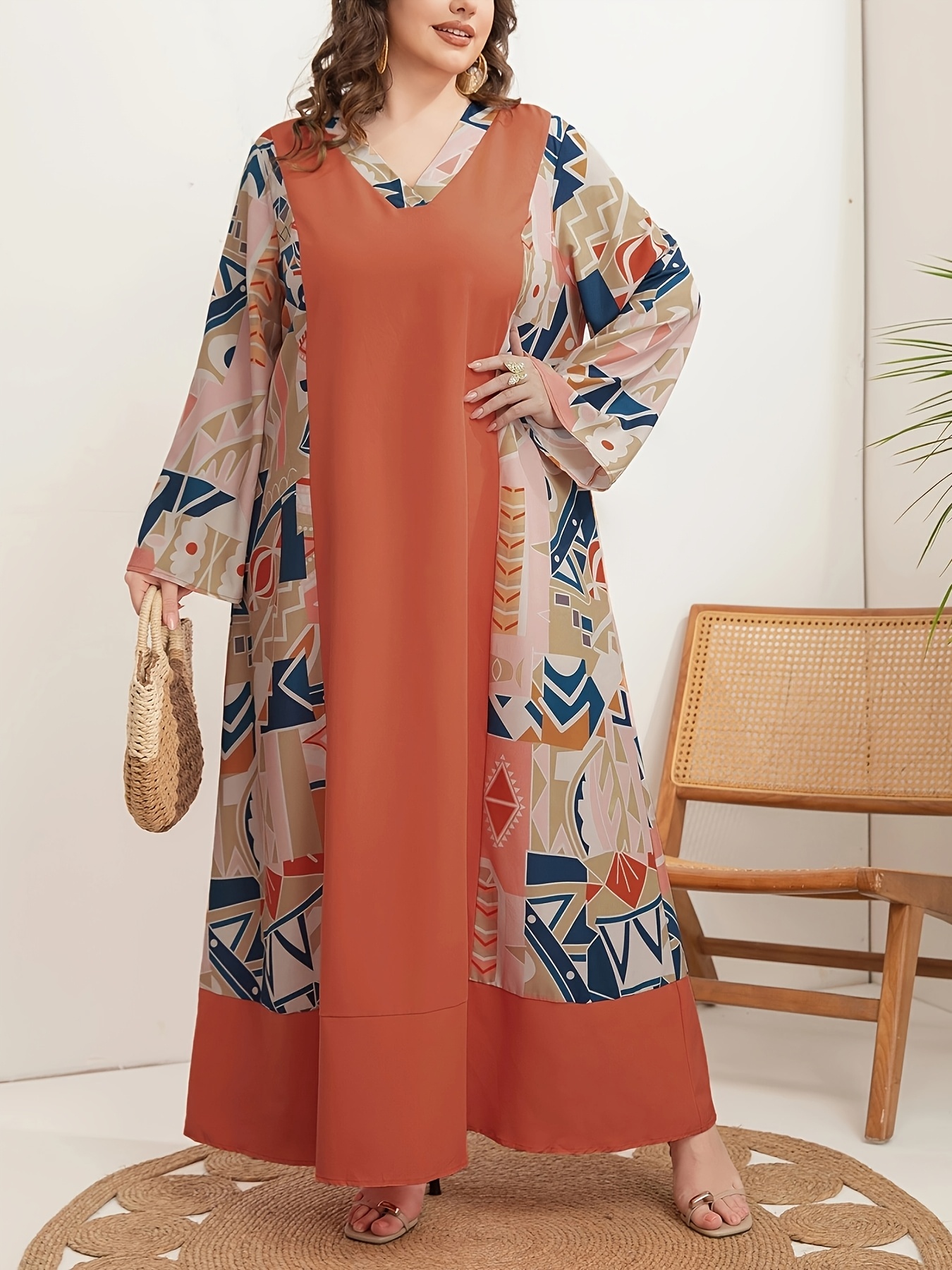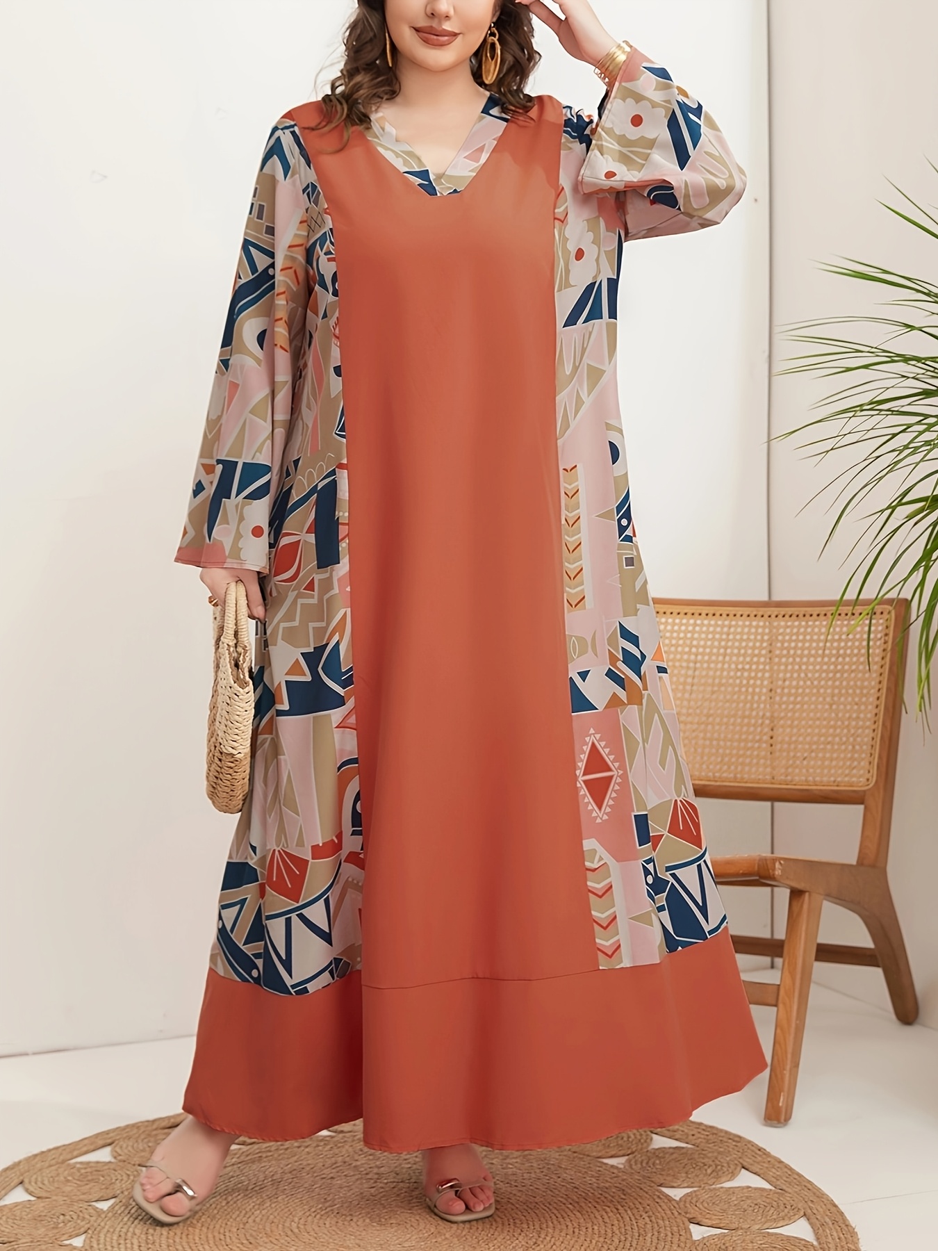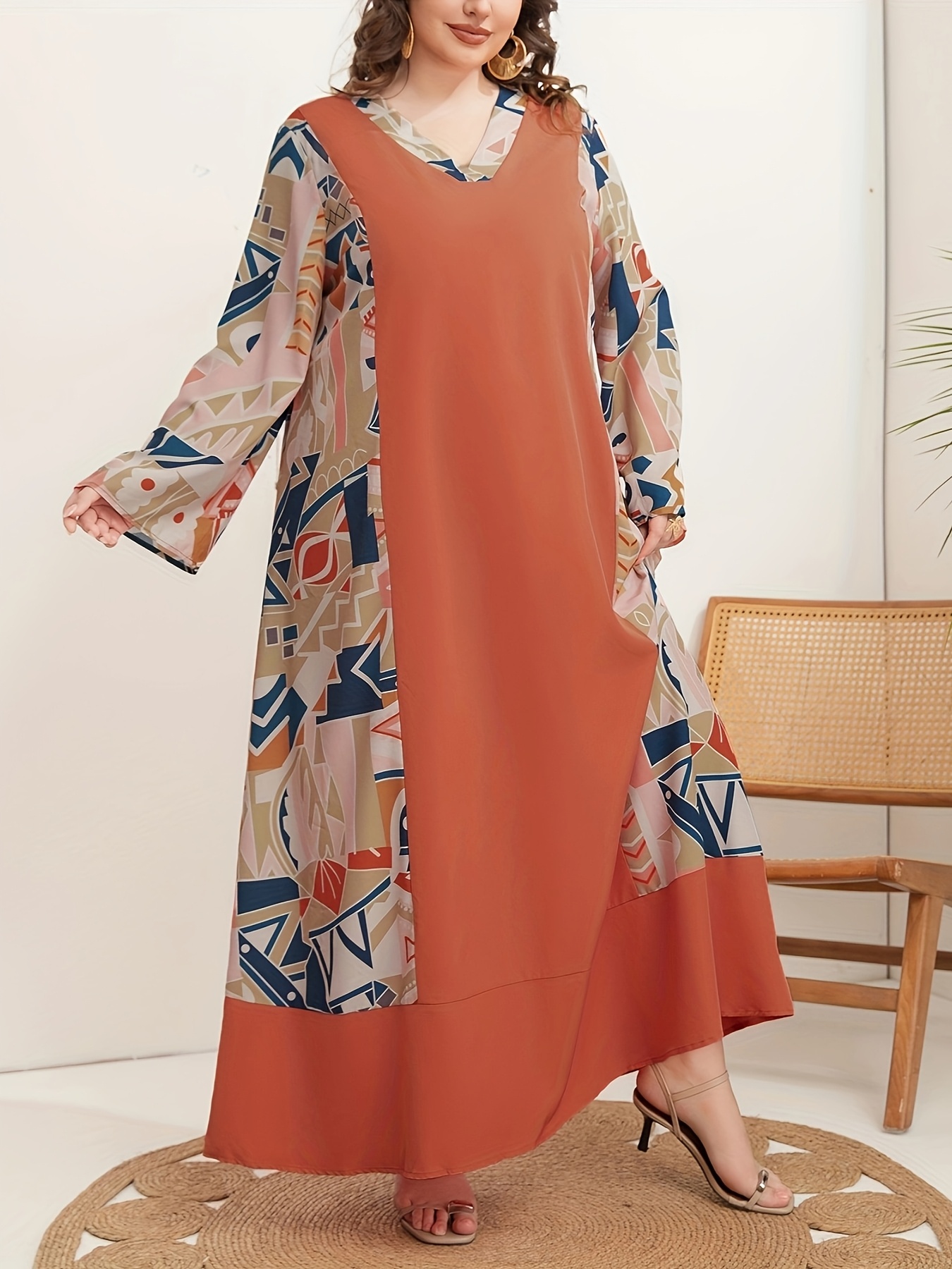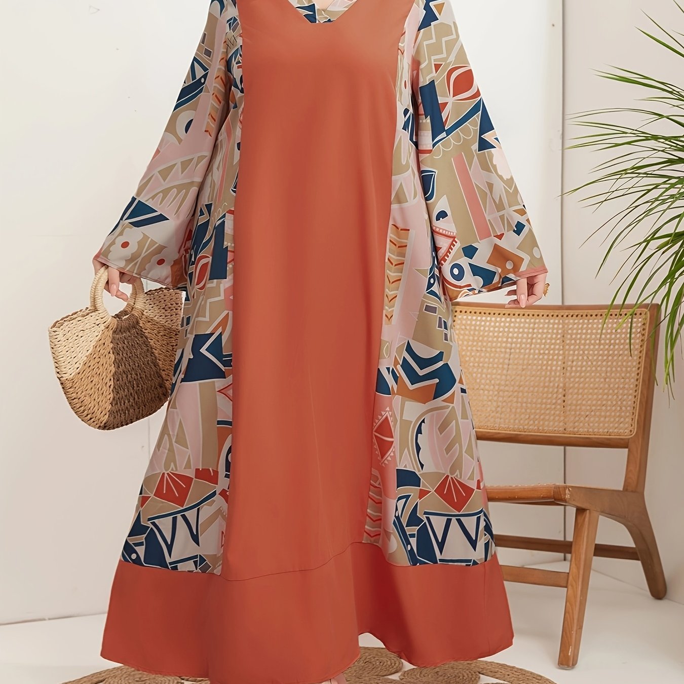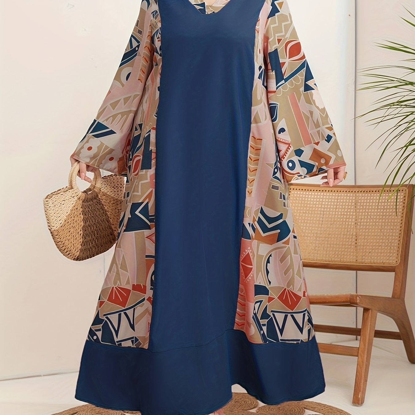فستان بطبعة V-نك وتصميم ملون مجرد – بوليستر، أكمام طويلة، غير شفاف – مثالي لجميع الفصول