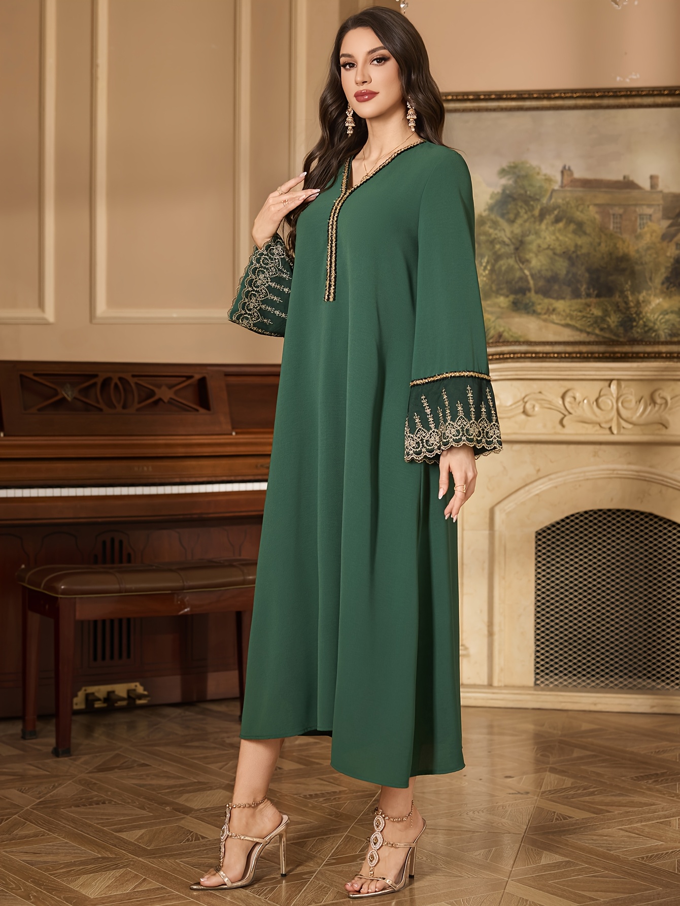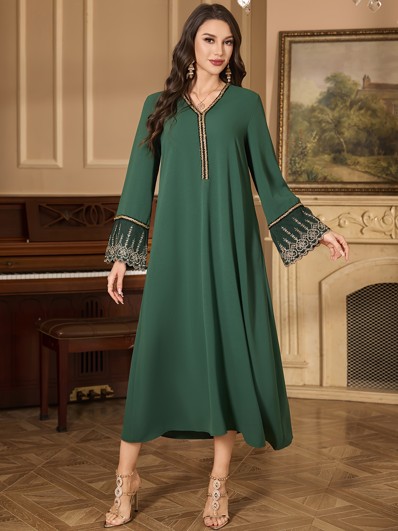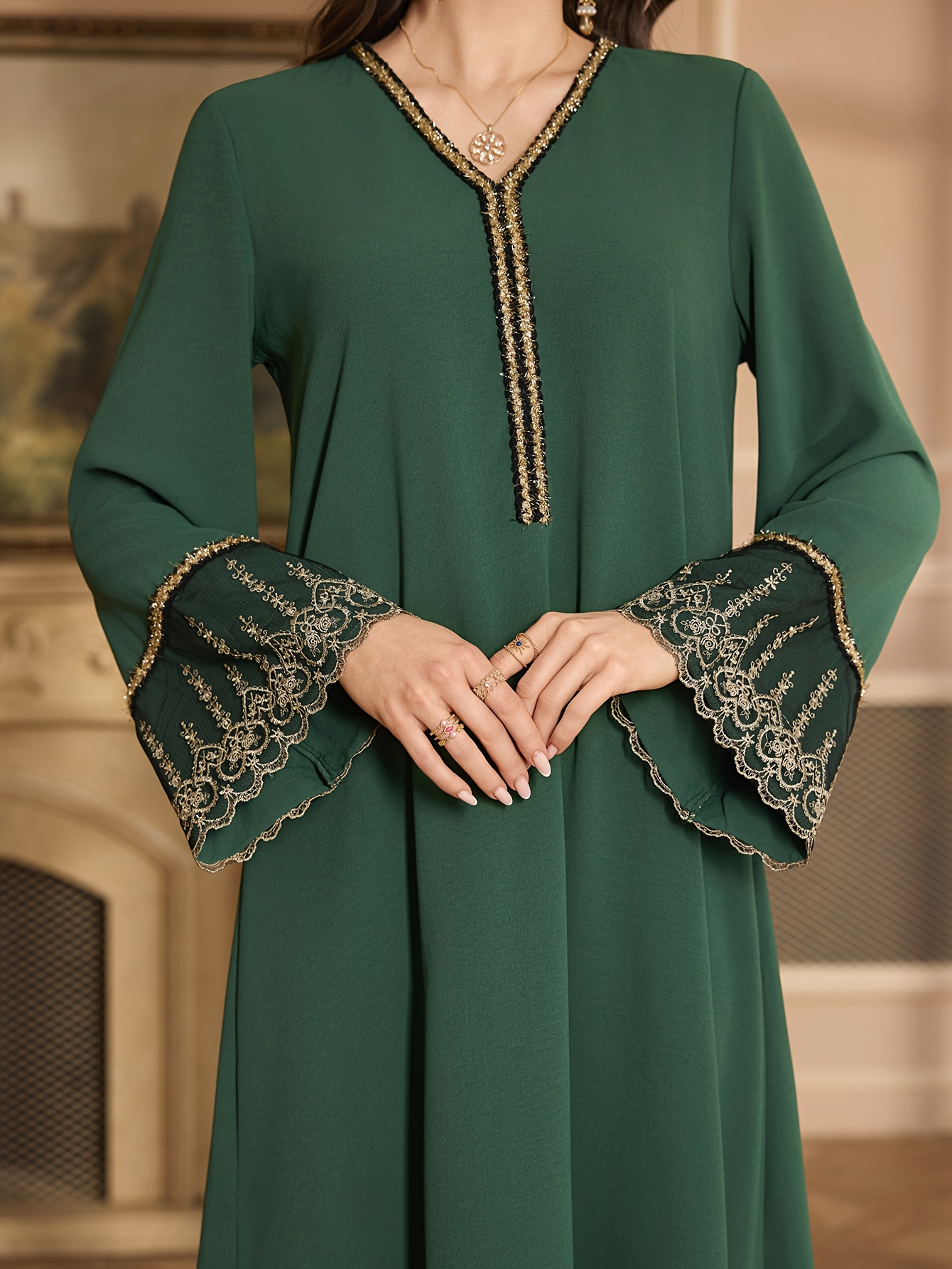 فستان نسائي أنيق بفتحة رقبة على شكل V وأكمام دانتيل وخصر ذهبي – أخضر زمردي تقليدي وعصري